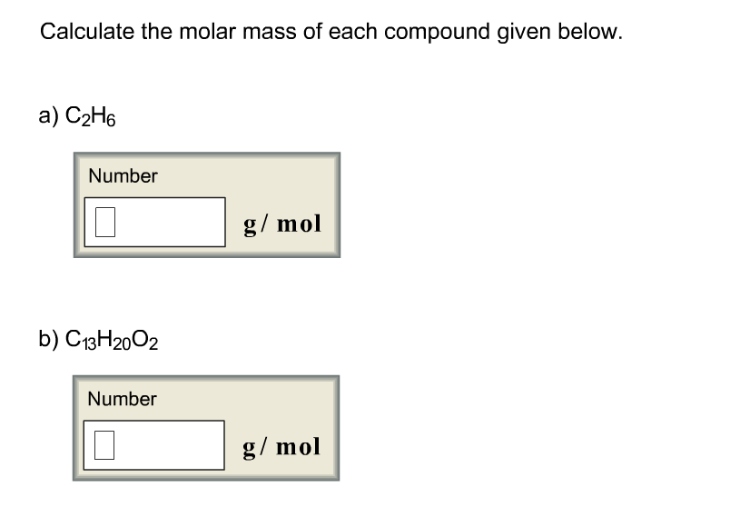 Answered Calculate The Molar Mass Of Each Bartleby from prod-qna-question-images.s3.amazonaws.com This chemistry video tutorial explains how to calculate the molar mass of a compound. To calculate m, multiply the molar mass of each element (atomic weight in g/mol) by its subscript and add the results. Molar mass efm = 27.7 g / m o l 13.84 g / m o l = 2. Fe, au, co, br, c, o, n, f. Molar mass= grams /moles, so we need to find the grams and divide that # by the number of moles 1. Molar mass (m) is the mass of one mole. Calculate the molar mass (m) of a compound, by multiplying the molar mass of each element by its subscript in the chemical formula, and add the results. One mole of any substance contains 6.02 × 10 23 particles.